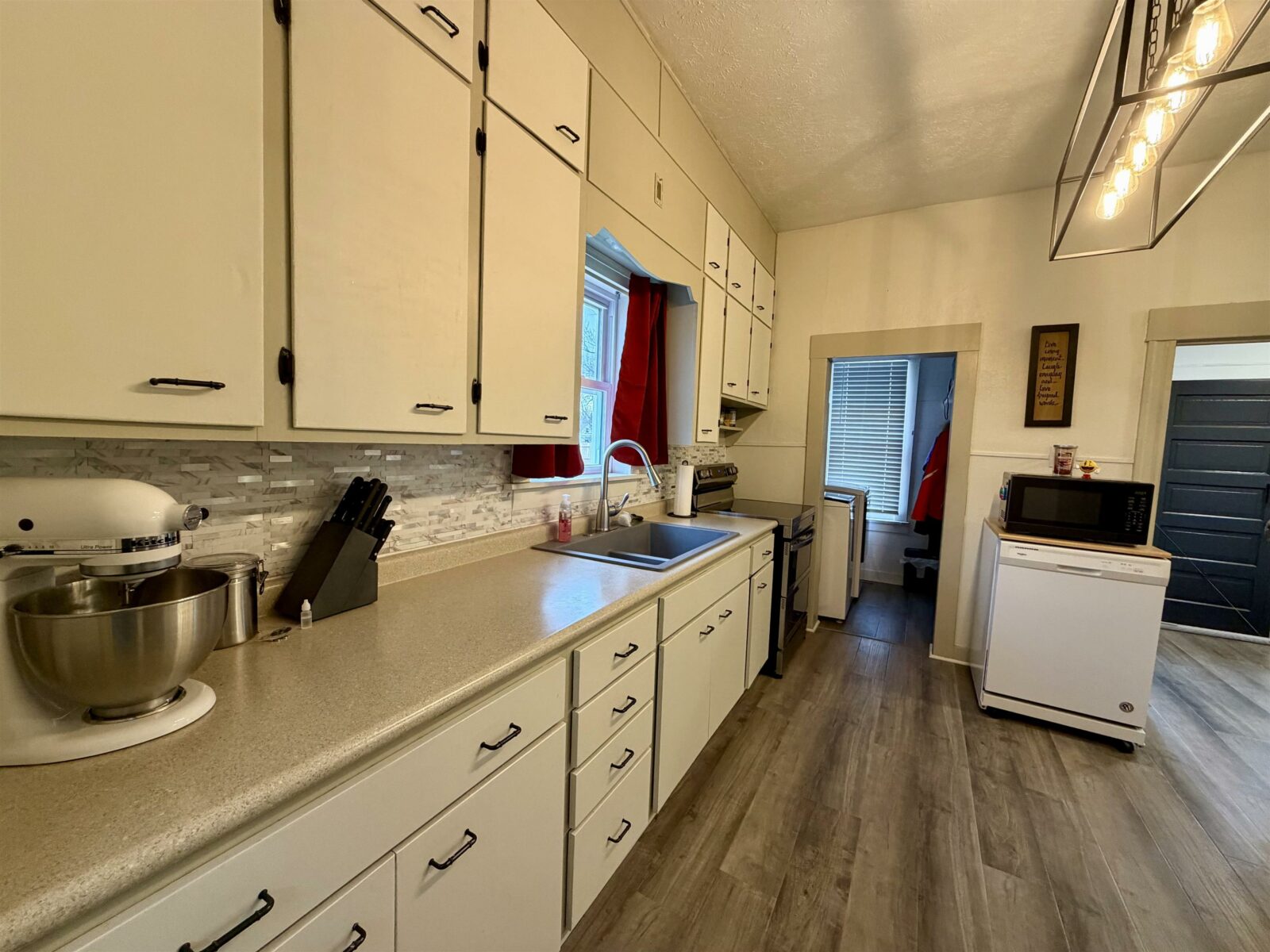 Portable dishwasher, stainless steel fridge in front entry, playground
